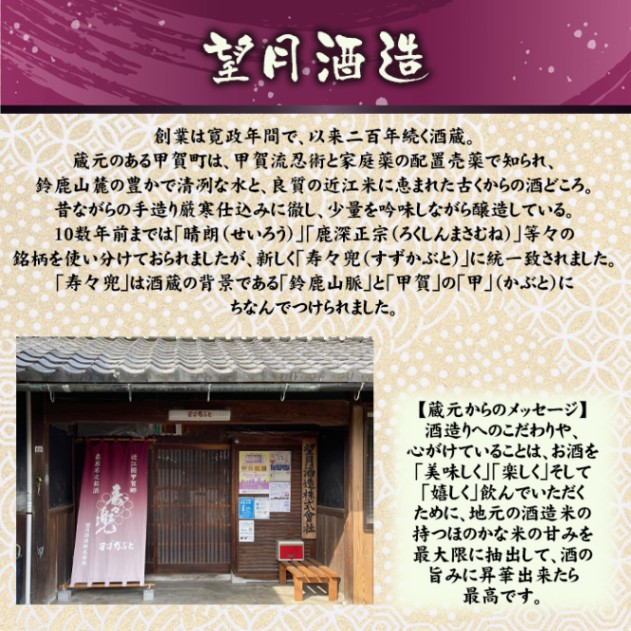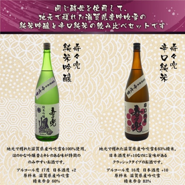 望月酒造・寿々兜の純米吟醸と純米の飲み比べセットです。 酒米は滋賀県産「吟吹雪」を使用しています。1.8L瓶*2本 ●販売者:望月酒造株式会社