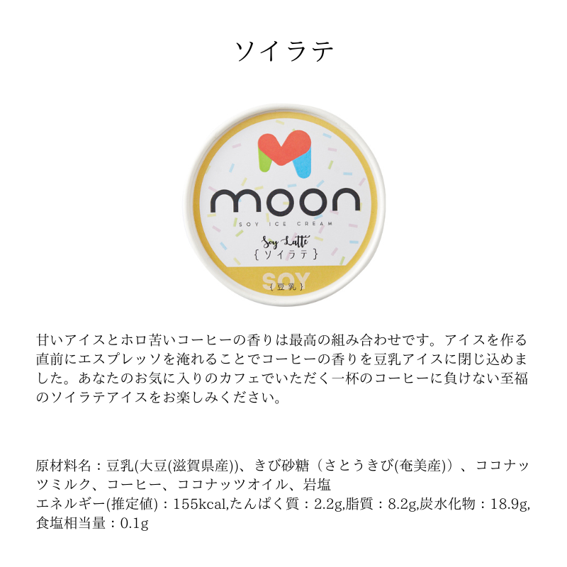 甘いアイスとホロ苦いコーヒーの香りは最高の組み合わせです。アイスを作る直前にエスプレッソを淹れることでコーヒーの香りを豆乳アイスに閉じ込めました。あなたのお気に入りのカフェでいただく一杯のコーヒーに負けない至福のソイラテアイスをお楽しみください。