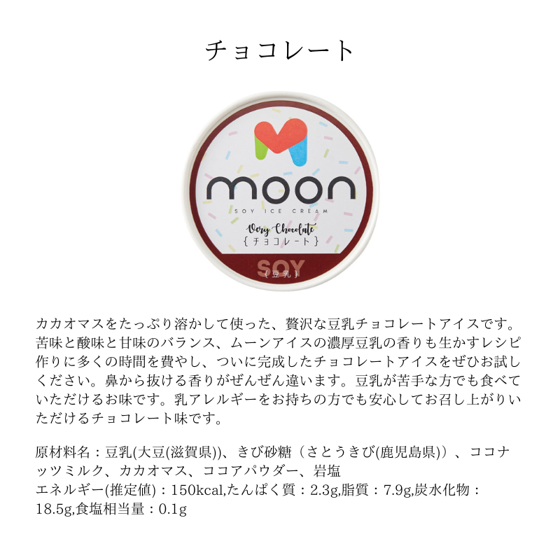 カカオマスをたっぷり溶かして使った、贅沢な豆乳チョコレートアイスです。苦味と酸味と甘味のバランス、ムーンアイスの濃厚豆乳の香りも生かすレシピ作りに多くの時間を費やし、ついに完成したチョコレートアイスをぜひお試しください。豆乳が苦手な方でも食べていただけるお味です。
