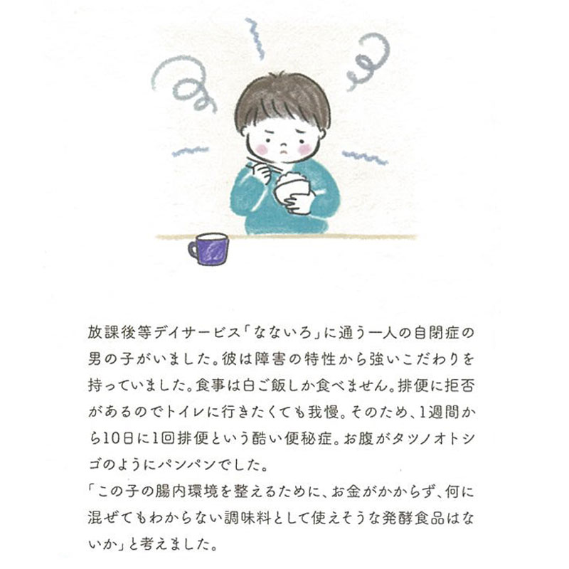 滋賀県の名産「鮒ずし」鮒ずしを苦手という人は多いが、この発酵の力が全く新しい調味料を作った。障害児施設の経営者が、自閉症の子どもたちの腸内環境を整えるために作った驚きの旨味を出す調味料に変身した。世界初。鮒ずしの発酵の力でできた調味料。具材の中まで味が浸透。特許第6810485号