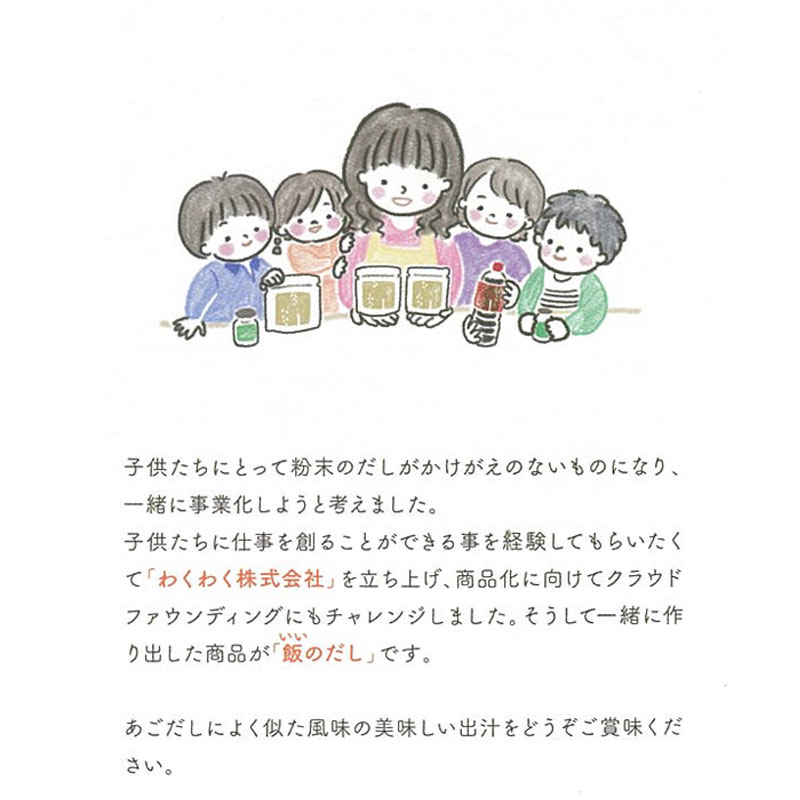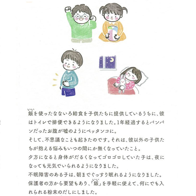 「飯のだし®」を入れてお米を炊くと、白ご飯が苦手だった子ども達がふりかけなしで白ご飯をおかわりするようになり、他の料理に使うと煮崩れしにくく、味の浸透がよくなる。