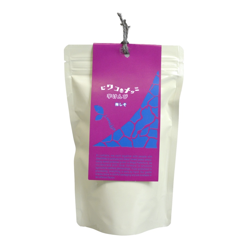 甘じょっぱい芋けんぴに、爽やかな梅しそのアクセント。クセになる大人の味わい。 ●名称:ルミエル ビワコノメグミ 芋けんぴ 梅しそ●内容量:100g●原材料名:さつまいも(滋賀県産)、植物性油脂、てんさい糖、赤しそ、食塩●栄養成分:熱量503.8kcalたんぱく質1.5g脂質22.4g炭水化物74.0g食塩相当量2.1g●賞味期限:4ヶ月●保存方法:直射日光・高温多湿を避け常温で保存してください●販売者:NPO法人ルミエル