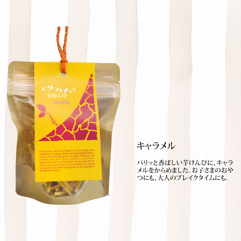 【キャラメル】パリッと香ばしい芋けんぴに、キャラメルをからめました。お子さまのおやつにも、大人のブレイクタイムにも。