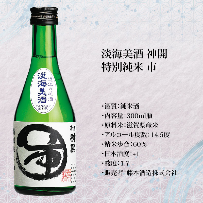 【淡海美酒 神開 特別純米 市】新酒に程よく加水する事により、重さが消えました。穏やかな香りで口当たりは軽く、温度が上がるにつれ強く旨みを感じさせます。